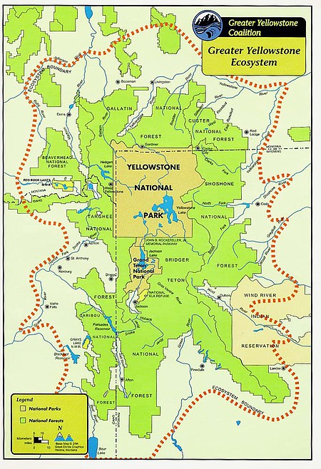 The ecosystem, with Yellowstone National Park at its core, extends into areas outside national parks in northwestern Wyoming, southwestern Montana and southeastern Idaho.