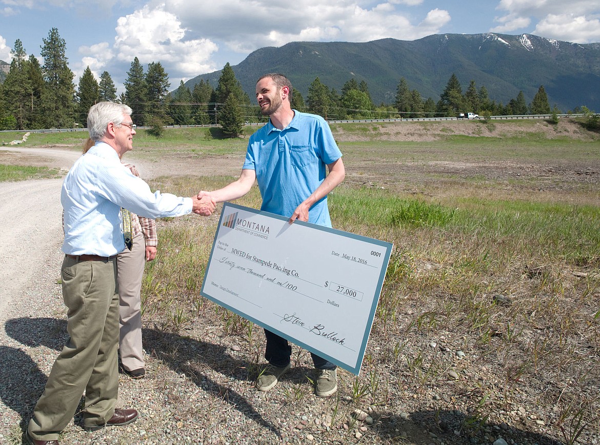 Kalispell-based Stampede received a $27,000 Big Sky Trust grant at the Columbia Falls industrial park Wednesday. Lt. Gov. Mike Cooney traveled to the Flathead to hand the check over and survey the potential site for Stampede’s future facility.