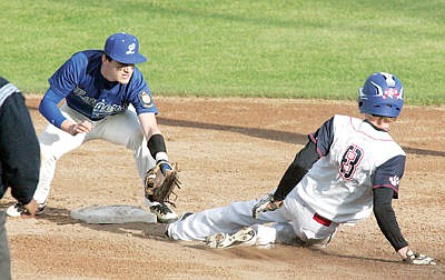 Shortstop Collin Johnson puts the tag on Skeeter Johnston as he tries to steal second top of the fourth vs. the Clark Fork Cougs May 19. Cougs over Loggers 6-3.