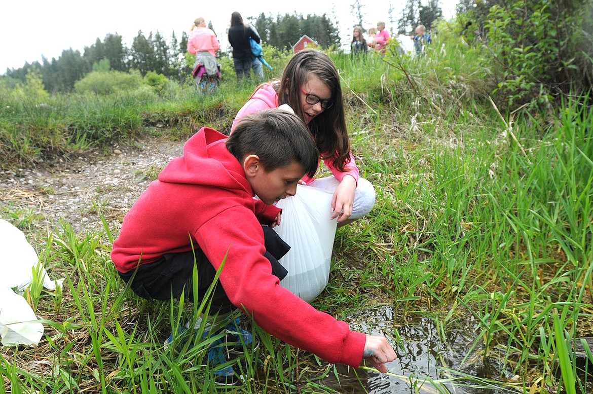 Edgerton fourth-graders Kamron Bigoness-Hunter, front, and Phaedra Chrz release westslope cutthroat trout into Buffalohead Pond during a Hooked on Fishing field trip with the Montana Fish, Wildlife and Parks on Thursday. (Aaric Bryan/Daily Inter Lake)