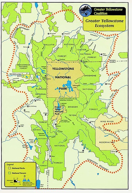The ecosystem, with Yellowstone National Park at its core, extends into areas outside national parks in northwestern Wyoming, southwestern Montana and southeastern Idaho.