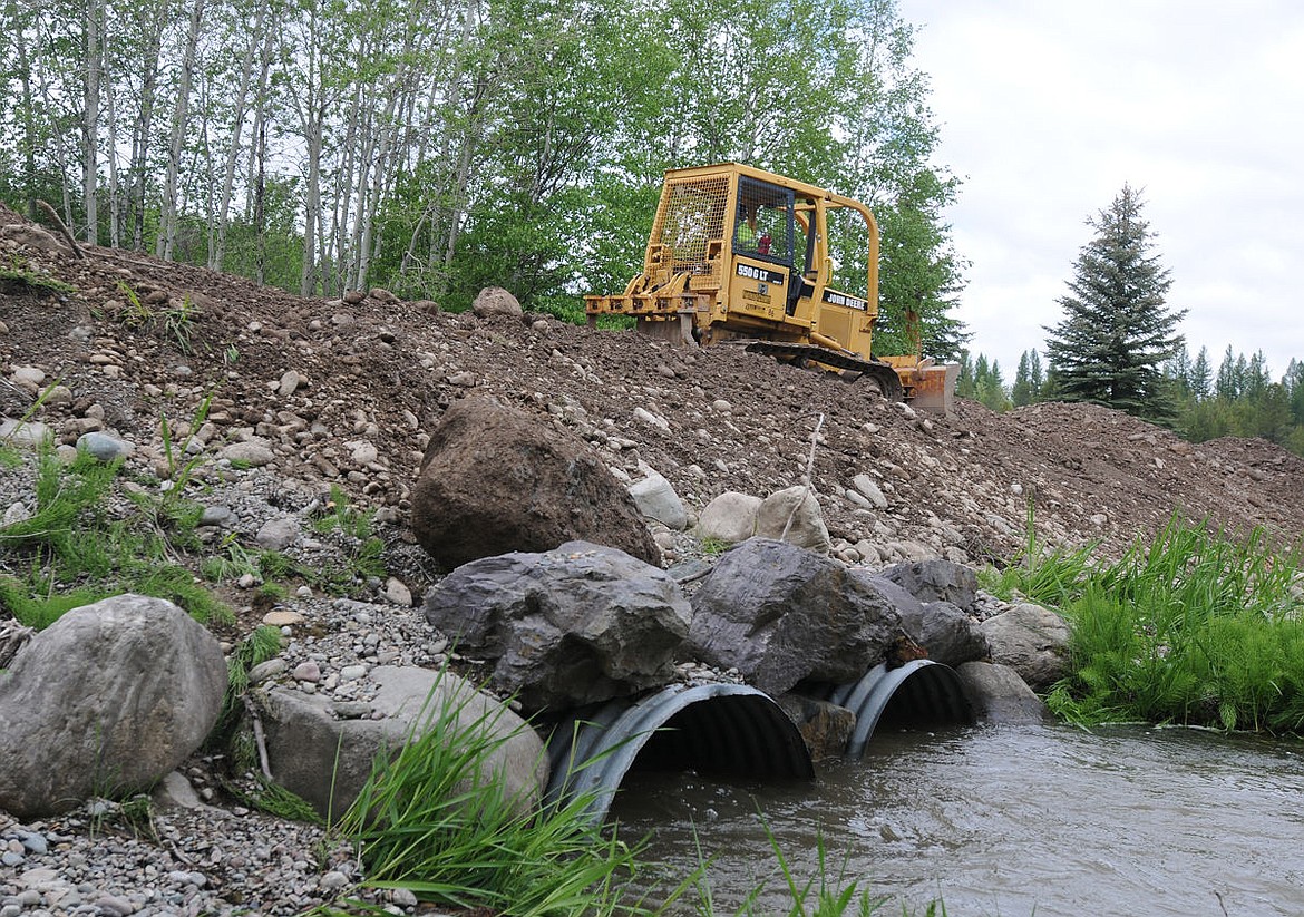 A bulldozer works to repair a section of Rabe Road on Wednesday. (Aaric Bryan/Daily Inter Lake)