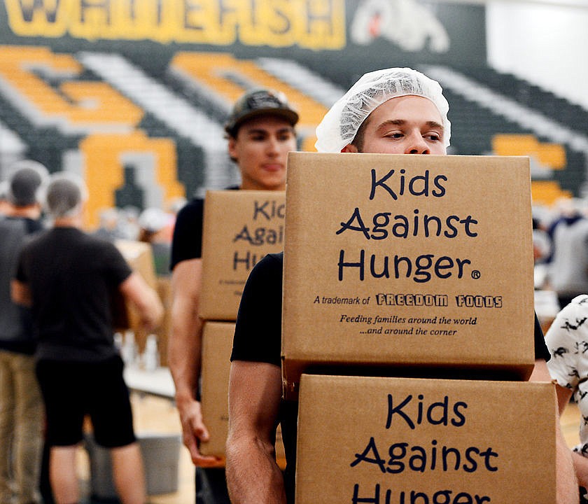 Luke May carries boxes filled with food packaged by Whitefish High School students to pallets for shipping on Tuesday, May 24, at Whitefish High School. May and around 500 other students and faculty members were involved in the Kids Against Hunger packing event that put together 50,000 meals, 15,000 of which will remain in the Flathead Valley. (Brenda Ahearn/Daily Inter Lake)