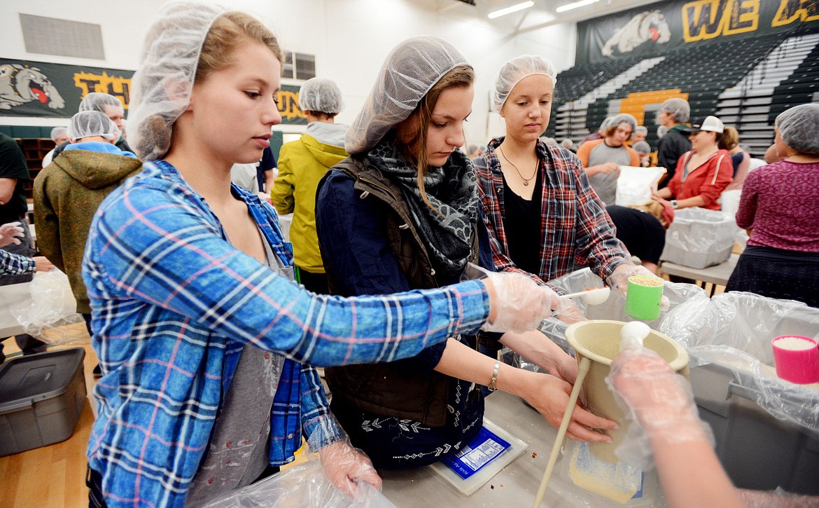 From left, Katie Dolan, Emily Iyga, and Heather Luedka fill packages with specifically measured out amounts of fortified soy, rice, dried vegetables and other ingredients as they participate in the Kids Against Hunger event on Tuesday morning, May 24, at Whitefish High School. (Brenda Ahearn/Daily Inter Lake)