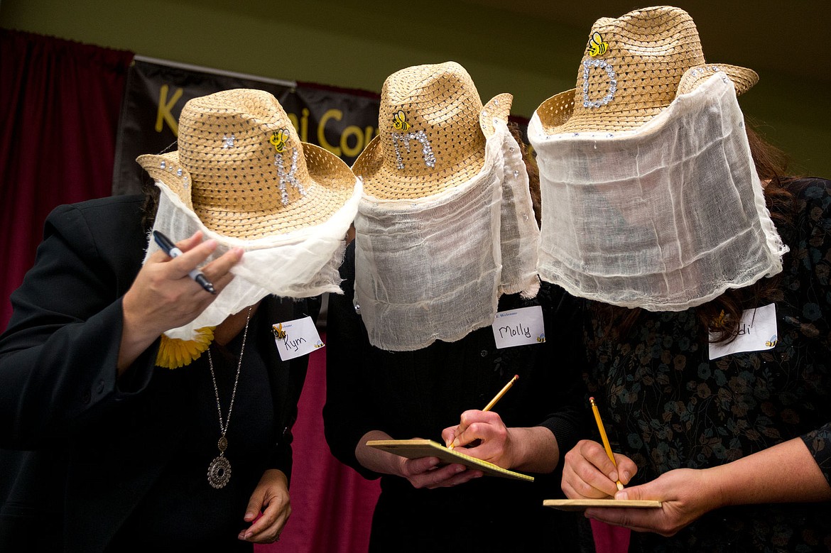 Ten teams of spellers 18 and older competed in Thursday’s bee, which took place in the Coeur d’Alene Room of the North Idaho College Edminster Student Union Building. The cleverly named teams included the "Nerdy Wordsters" from the City of Post Falls, second-place team "Eleemosynary" (meaning "charitable") of North Idaho Eye Institute, "The Killer Bees" from the North Idaho Retired Educators Association and NIC’s "Bee-Dazzled" team, whose members livened up the party by wearing beekeeping hats with mesh veils.