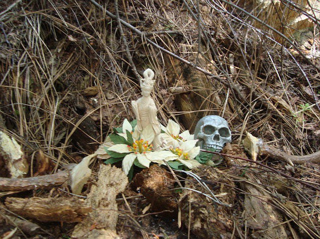 Kim Ashbaugh of Coeur d'Alene first spotted the "vandalism" on April 18 and as of Thursday she said it was still occurring on a regular basis. The man recently began leaving behind plastic flowers with miniature items such as a skull and totem pole, which Ashbaugh said she removed Wednesday evening.