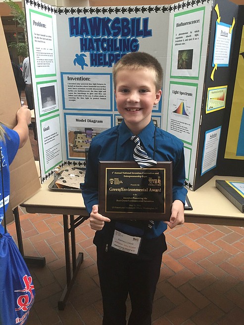 Skyway Elementary School third-grader Zachary Linford, 8, earned the "Environmental/Green Award" for inventing "The Hawksbill Hatchling Helper," which is designed to help baby hawksbill sea turtles find their way to the ocean. The hawksbill turtle is critically endangered, and Zach is on a mission to change that by using a special lighting system to lead the hatchlings where they need to go. Habitat destruction and manmade lights have made it difficult for the little turtles to find their way.