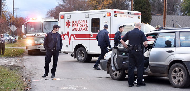 Kalispell police officer Garrett Smith, center, interviews the driver of a vehicle that struck the concrete barriers where Woodland turns onto Center Avenue on Tuesday evening, November 1, in Kalispell. Kalipsell Fire was also dispatched to the scene but the driver of the vehicle was not transported to the hospital. The wreck caused a brief road closure.