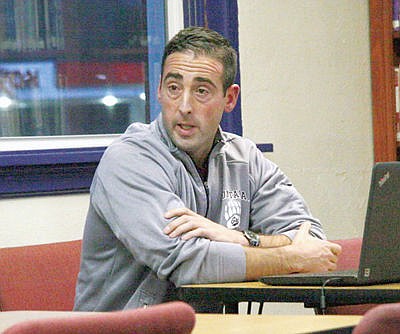 Troy Public Schools Athletic Director Jeff Hawk leading the informational meeting on the possibility of Troy High School to change to a Class C school. (Bethany Rolfson/TWN)