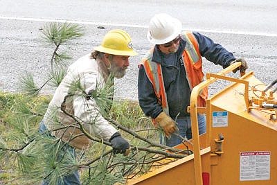 Workers from Robinson Brothers of Rathdrum, Idaho, put tree limbs in a wood chipper on Tuesday. The tree limbs were cut when fiber optic cable was installed on telephone poles on Montana 37 north of Libby. (Caleb M. Soptelean/TWN)