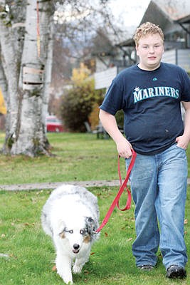 Tim Lundstrom, 15, walks his dog, Sky, an Australian shepherd, on Wednesday evening in Libby. (Caleb M. Soptelean/TWN)