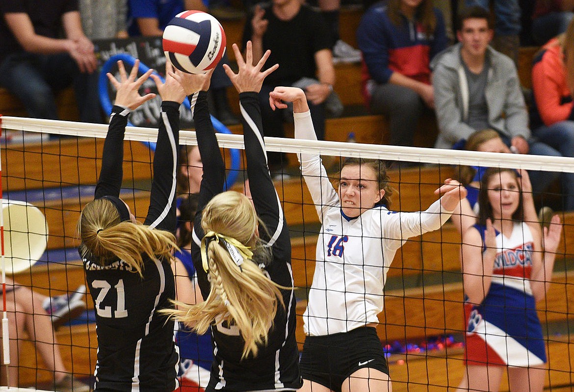 Columbia Falls senior Keavyn Baker blasts the ball past a pair of Stevensville defenders during the Wildkats' 3-game victory at the Western A Divisional Tournament in Columbia Falls on Thursday. (Aaric Bryan/Daily Inter Lake)