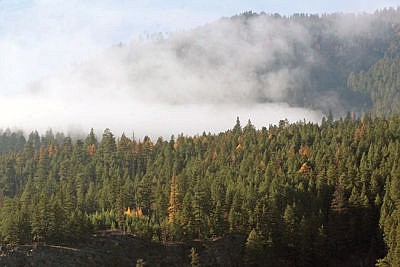 Fog wafts over the mountains above Kootenai Falls on Saturday. (Caleb M. Soptelean/TWN)