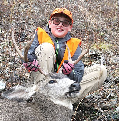 Maverick Owens, 13, of Libby with his first deer. Owens took the three-by-four mule deer with a .308 FN SCAR on Nov. 6, while he was hunting with his parents Scott Hanson and Dorian Boling, also of Libby. (courtesy photo)