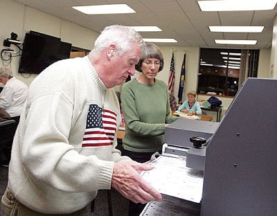 Ballot counting with election judges Corky Watson, left and Ellen Frament. (Paul Sievers/TWN)