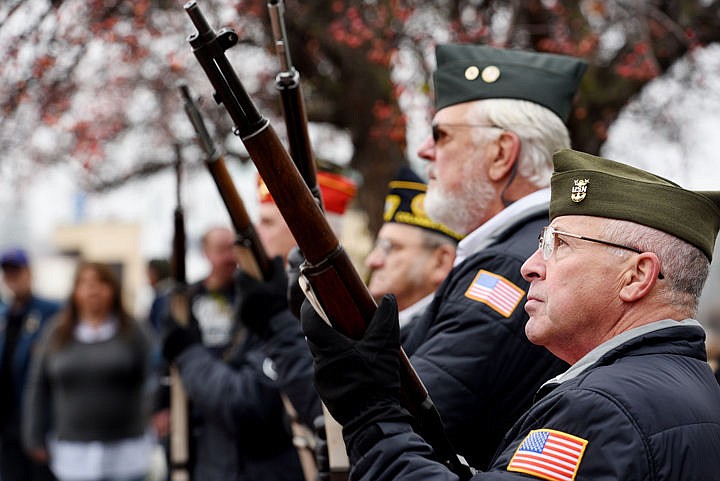 The Honor Guard prepares to fire three volleys at the close of the Veterans Day ceremony at Depot Park on Friday morning, November 11, in downtown Kalispell. (Brenda Ahearn/Daily Inter Lake)