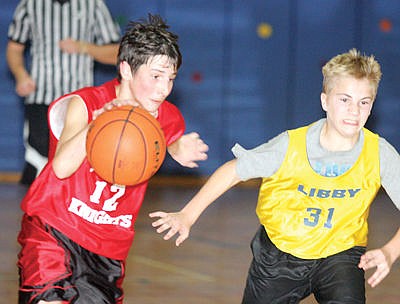 Troy's Dylan Peterson drives past Ryder Davis to score in the second half during the roundball Jamboree at Libby Elementary Saturday. Loggers over Knights 34-24. (Paul Sievers/TWN)