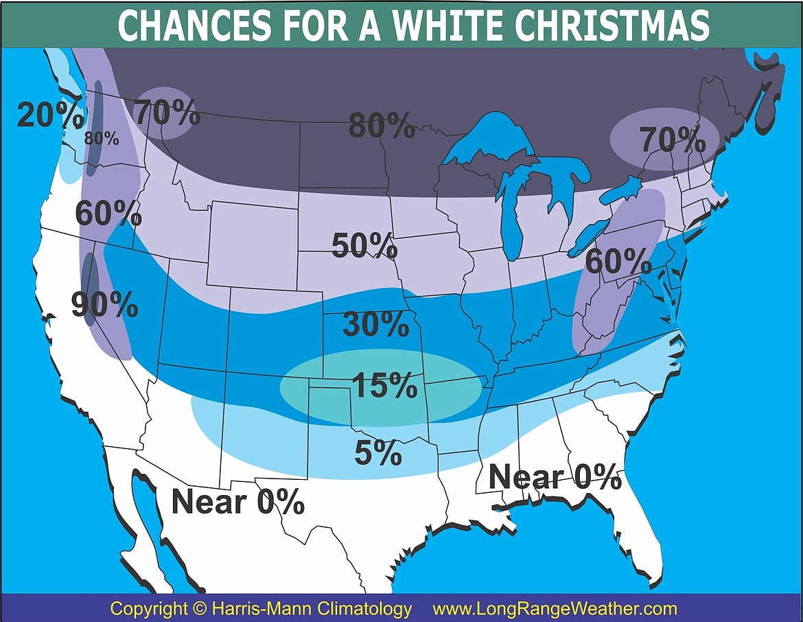 Cities and towns in the central U.S. near Interstate 70 eastward to the Mid-Atlantic states likewise have around a 30 percent chance of seeing snow on the ground on Dec. 25. There is only a 10 percent chance of a White Christmas across parts of the southern U.S. this year, but anything is possible in this cycle of wide weather extremes.
