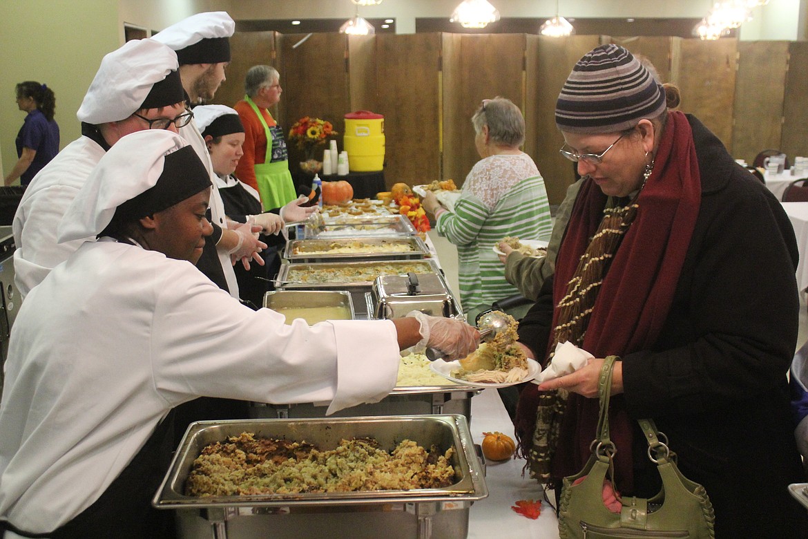 From green bean casserole, to stuffing, pumpkin pie, cranberry sauce, and, of course, turkey, Wednesday’s free dinner featured a full Thanksgiving spread prepared and dished up by students from the Columbia Basin Job Corps Culinary Arts Program. The dinner itself might have been a week early, but the theme of togetherness was evident as the community packed out the Elks Lodge on North Stratford Road. In past years the dinner was well attended, but nothing like the turnout on Wednesday. The line of people waiting to eat stretched from the inner part of the building all the way out to the front door at times.