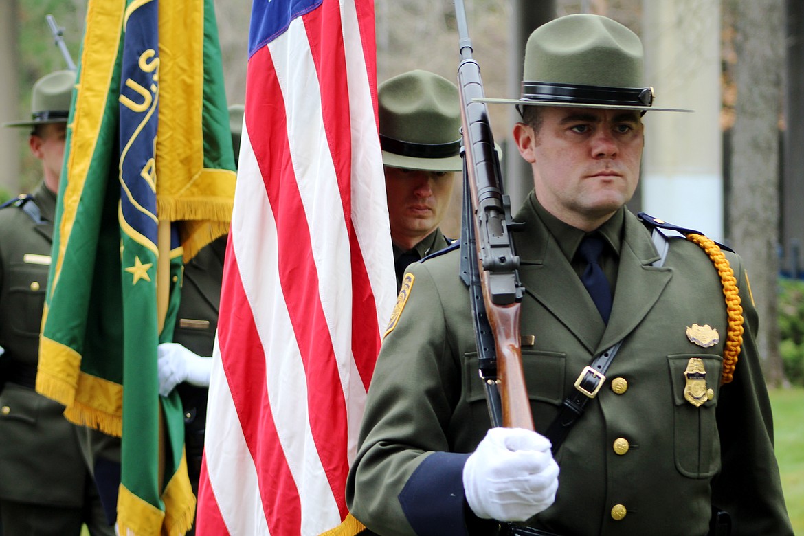 Guest speaker District 1 Sen. Shawn Keough stood with more than a 100 area residents, falling silent at 10:55 a.m., during the presentation of the American flag led by the U.S. Border Patrol Honor Guard.