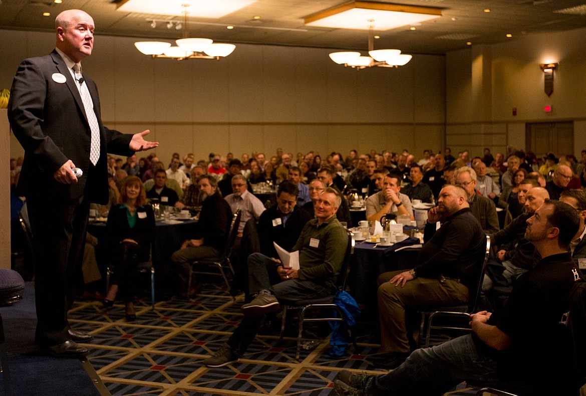 With a former Eastern Washington University football player pulled from the crowd and behind him on stage as fullback, Conklin used the fellow to illustrate the leadership principle of engaging and developing others by handing off to him and letting him do work near the goal line.