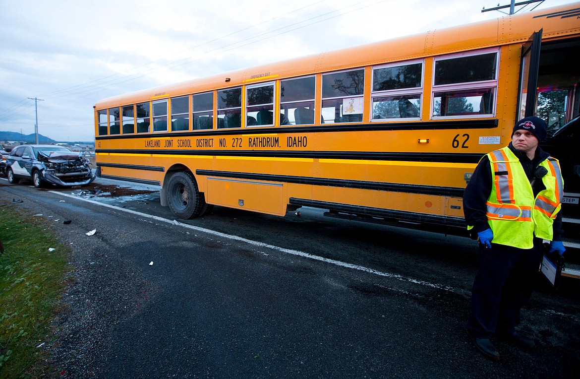 Six students, who were aboard the Lakeland Joint School District bus when it was struck while it was about to turn east onto Lancaster from southbound Highway 41, were evaluated on scene for minor injuries and not transported to the hospital, according to Idaho State Police.