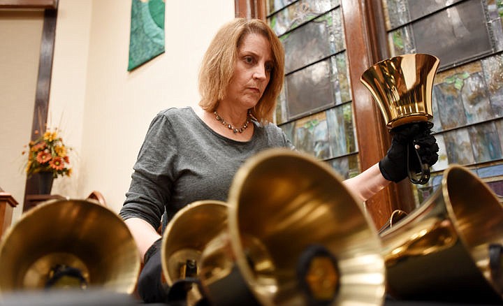 Karen Leftwich focuses intensely as she plays the largest bells in the Alpine Ringers handbell choir as they practice on Monday, Nov. 14, at the First Presbyterian Church in Whitefish. (Brenda Ahearn/Daily Inter Lake)
