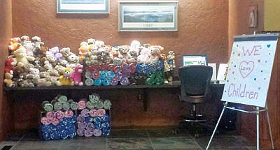 In the lobby of The Lincoln County Credit Union, around 100 teddy bears and blankets sit on display. These were purchased by the credit union for the local law enforcement to give to children when they are taken from homes.