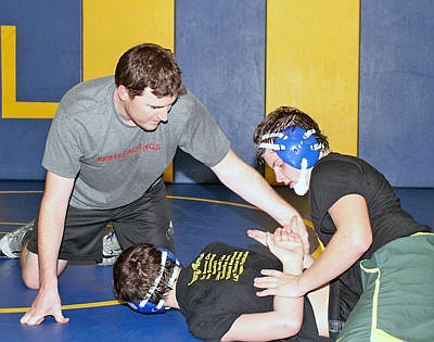 Greenchain head wrestling coach Kelly Morford, left, and freshmen Trey Thompson and Cyrus Sweedman. (Paul Sievers/TWN)