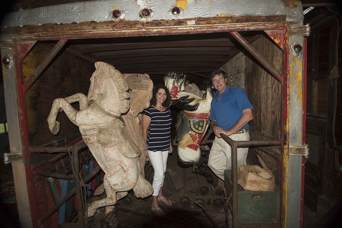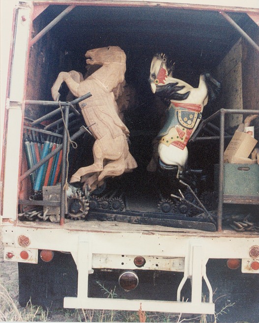 The carousel was packed into two cargo trailers and stored in a field outside of Kansas City, Mo., after a Midwest traveling fair shut down for the 1952 season and never reopened. Clay and Reno Hutchison of Sandpoint saved the carousel from being broken up and sold at auction when they purchased it 16 years ago. The Hutchisons moved it to a storage barn in upstate New York until it was recently delivered to Sandpoint.