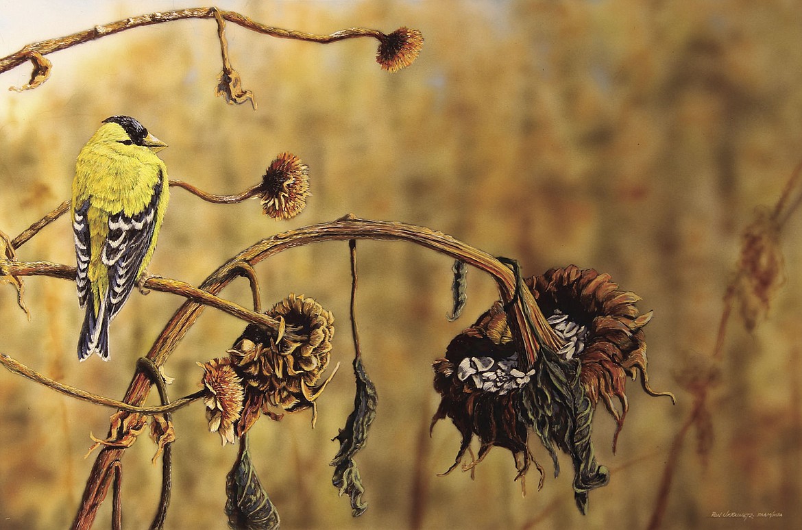 Ron Ukrainetz was the second-place pick, earning $100. His work “Gold in the Fall” is a polychromatic engraving featuring a small, yellow bird perched on a wilting plant. The Great Falls resident often features wildlife in his works.