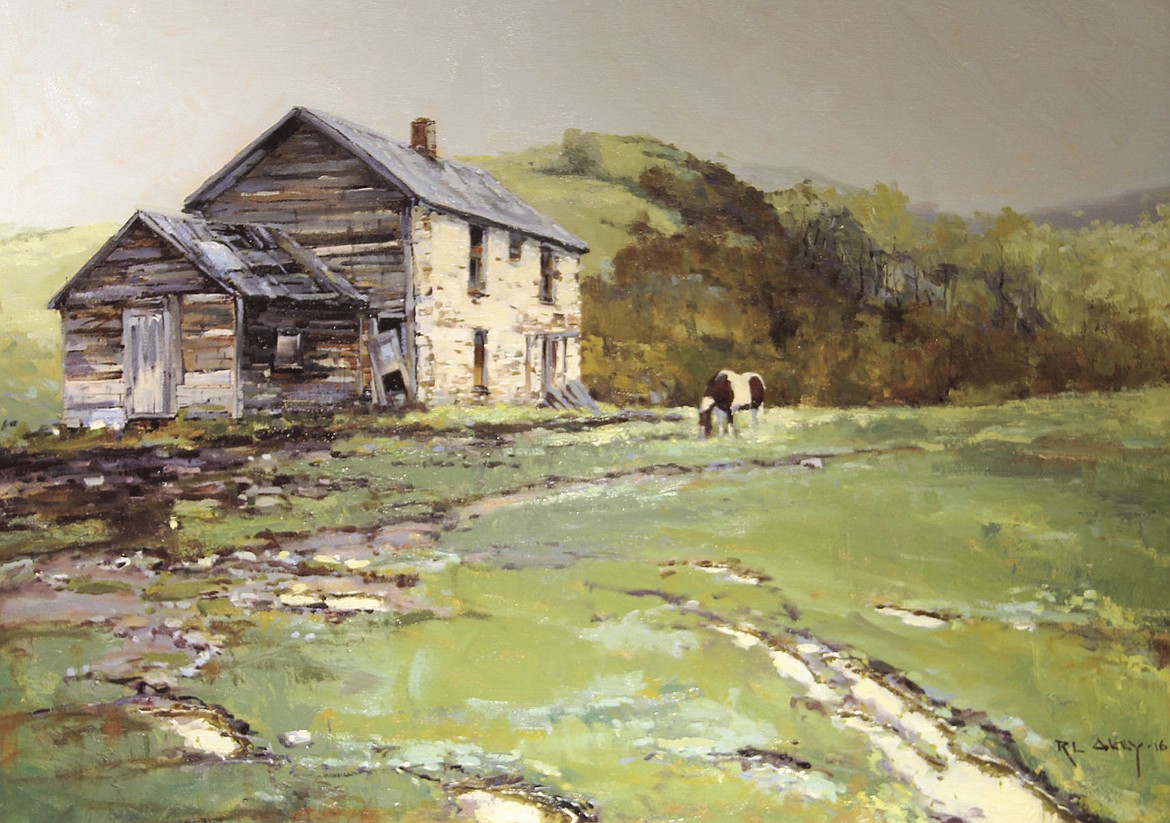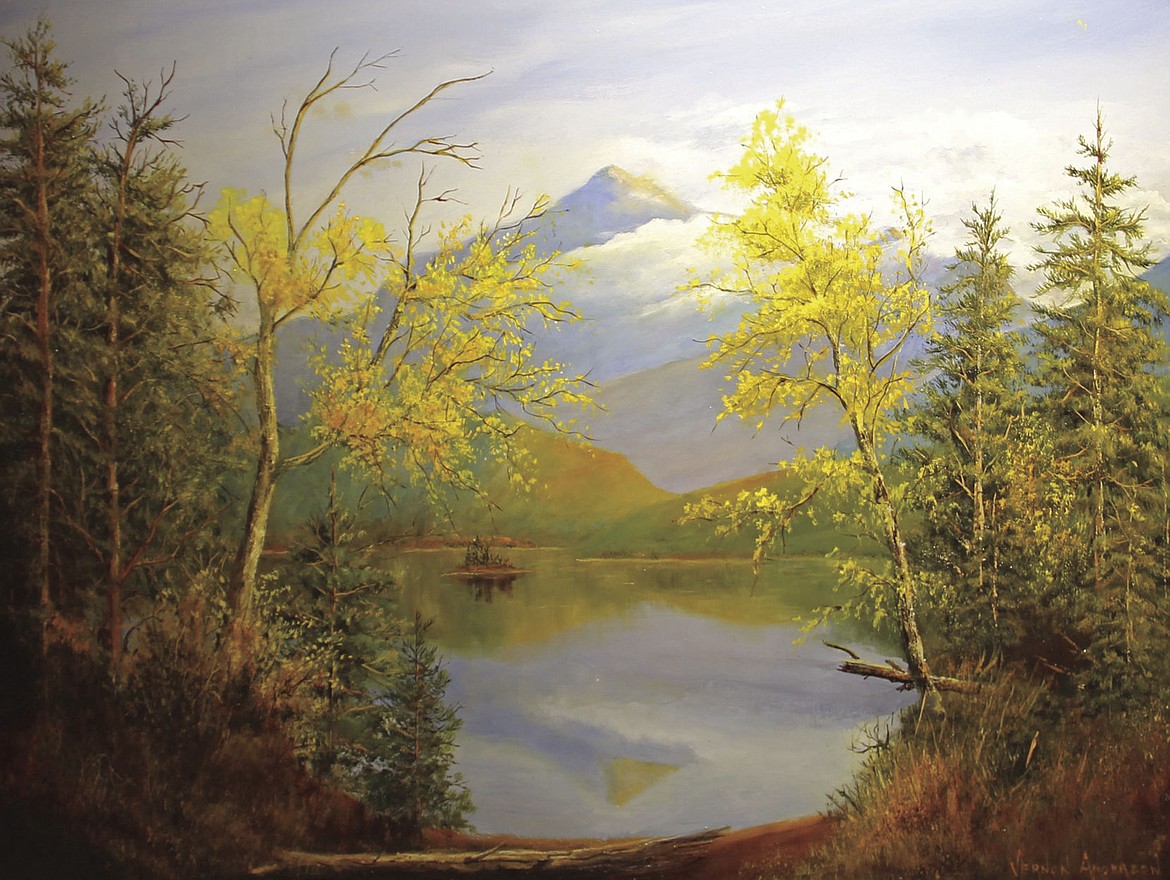 Akey’s oil paining, “Montana Homestead,” is a farm scene featuring a weathered farmhouse, while Anderson’s “Lake Five” is a serene Glacier National Park landscape.