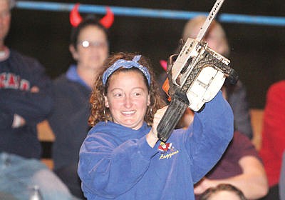 Crystal Pepmiller fires up her celebratory chainsaw following a Logger touchdown in third quarter. (Paul Sievers/TWN)