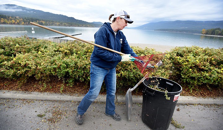 Landscape foreman Jen Sybrant trims the hedges down at City Beach on Tuesday morning, October 4, in Whitefish. (Brenda Ahearn/Daily Inter Lake)