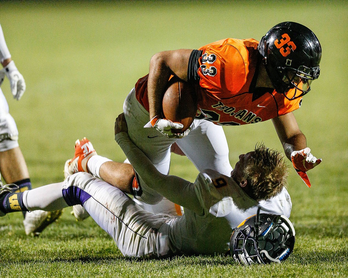 Coeur d’Alene Vikings 36, Post Falls Beavers 20: For the Vikings, Ty Pottenger 1 Int, 4 catches, 53 yards, 22 rush yds,1 rec td, Trent Elstad 4 tackles, 78 rush yds, 2 rush tds, 78-yd kickoff return TD, Jack Prka 13-21-115 passing, 15-yd td pass, 72 yards rushing, Zander Kerns 2 tackles. Tanner Payton 2 tackles. Dalton Cardinal 1 Int, 2 receptions, 47 yds, Jackson Kohal 1 reception, 33 yds, 4 tackles, Mason Cummings 4 tackles,1 reception, 8 yds. Hudson Gilbert 1 fumble recovery, 6 points kicking, 4 tackles. Jacob Bishop 3 tackles.