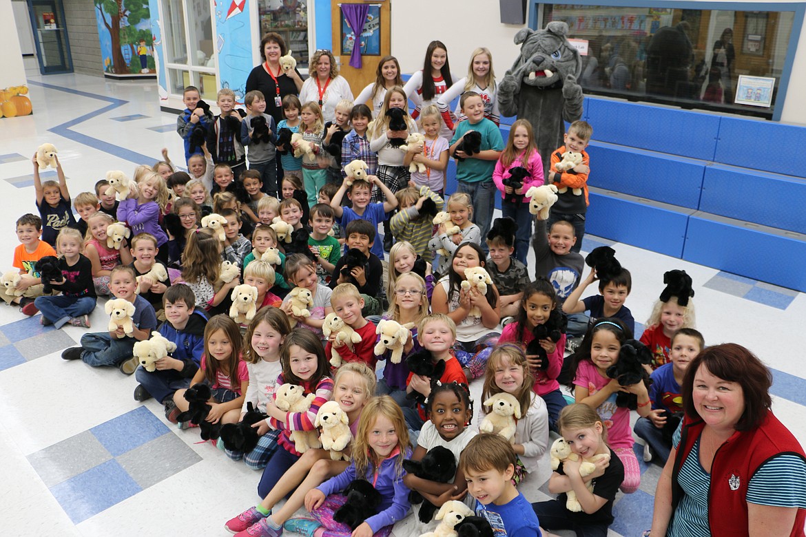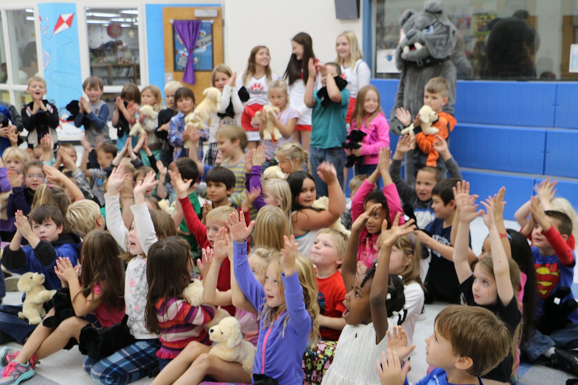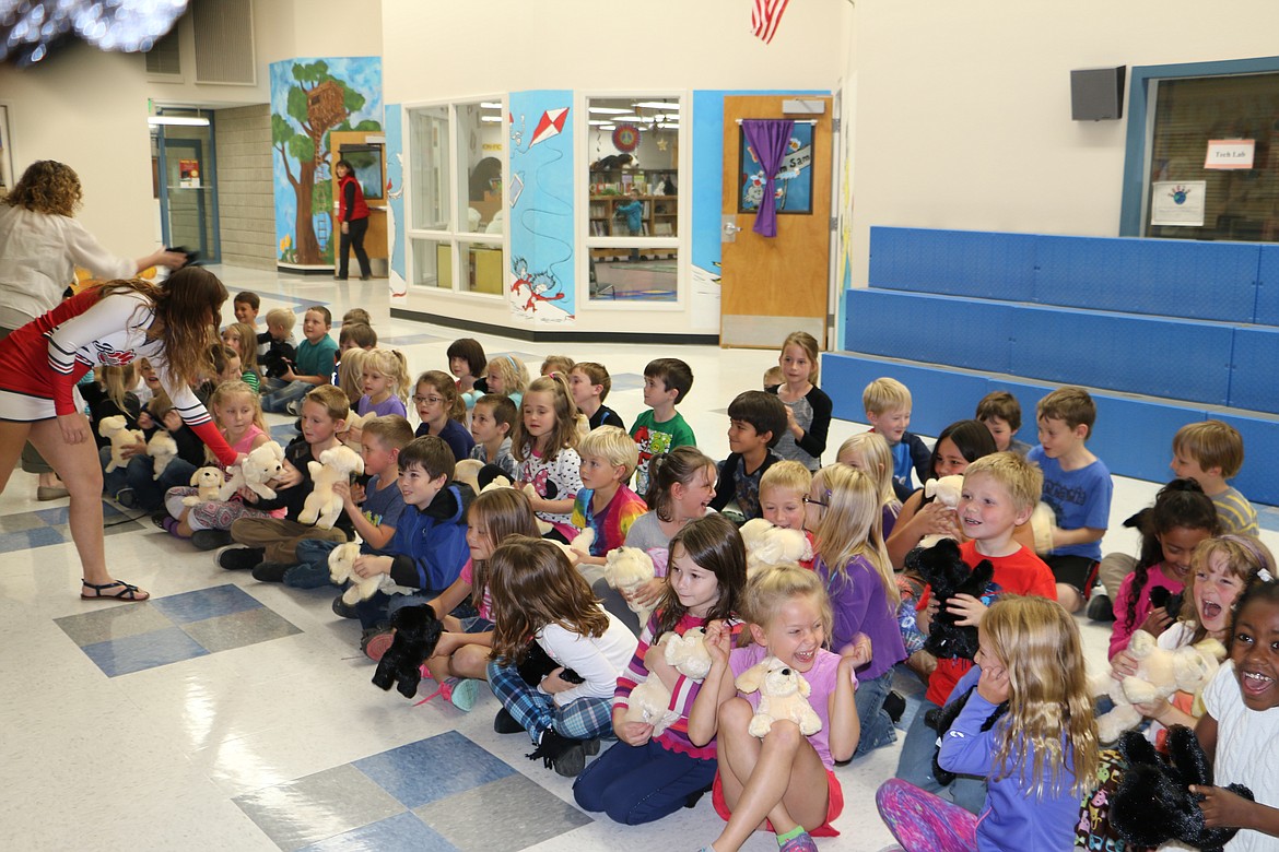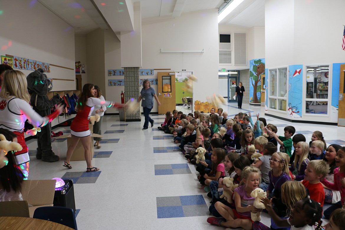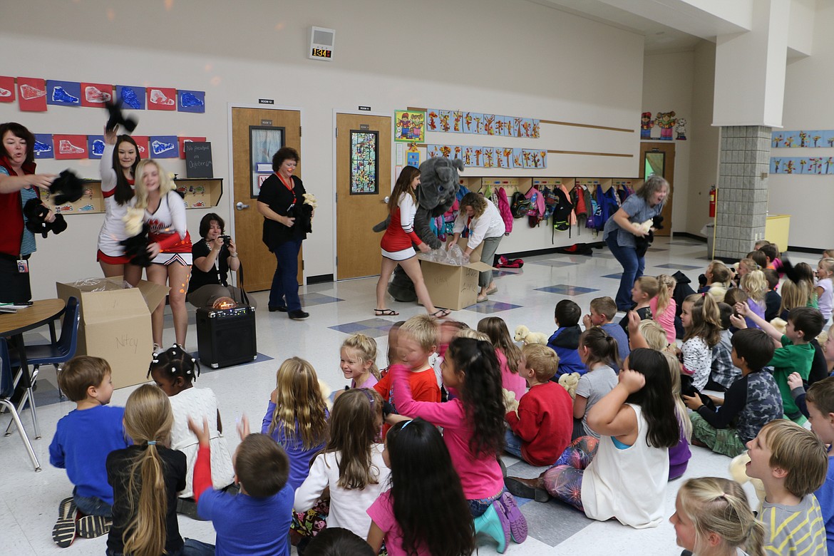 Spike the Bulldog and three cheerleaders from Sandpoint High School went to the elementary school Thursday to give the kids their reading puppies. As Spike and the cheerleaders prepared to open the boxes, the students were asked if they like to read and who their favorite book characters are.