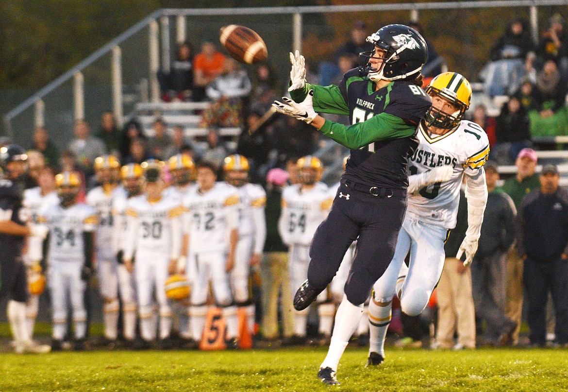Glacier receiver Andrew Durado hauls in a pass from Tadan Gilman and runs for a 60-yard touchdown during the first quarter against Great Falls C.M. Russell at Legends Stadium on Friday. (Aaric Bryan/Daily Inter Lake)