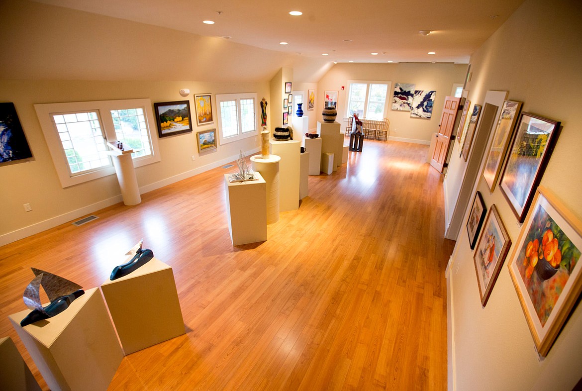 Abstract paintings and 3D sculptures hang on the walls of the Jacklin Arts and Cultural Center gallery. In the center of the room, display stands host handmade pottery, baskets made of fabric material and books that have been transformed into sculptures.