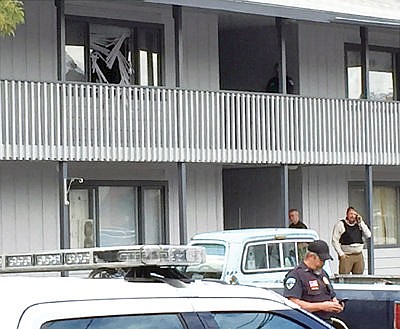 Broken window of Trevor Mercier's residence at Park Apartments No. 43 with Boyd White, left, Chief Terry Watson and Sheriff Roby Bowe. (Paul Sievers/TWN)
