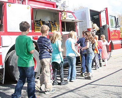 Libby third graders line up to walk through the inside of a Libby Volunteer firetruck on Tuesday. (Bethany Rolfson/TWN)