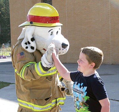 Sparky the Fire Dog (Ryan Carpenter) giving a high-five to Libby third-grader Paxton during National Fire Prevention Week. (Bethany Rolfson/TWN)