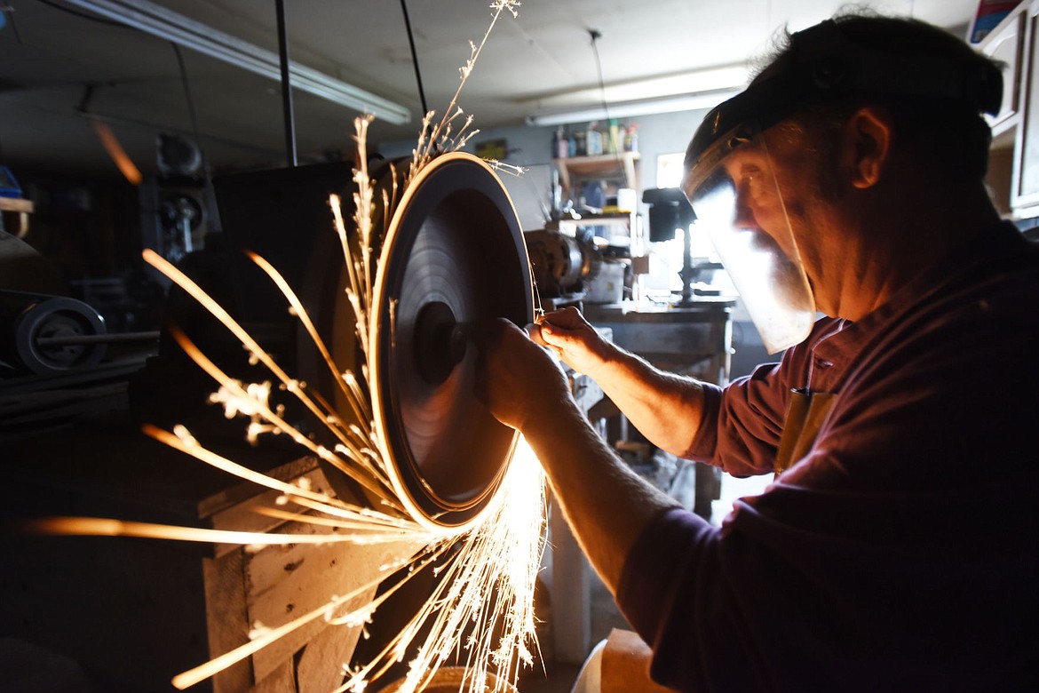 Sparks fly as Rick Schmidt works in his shop on Thursday morning, October 13, in Whitefish. (Brenda Ahearn/Daily Inter Lake)