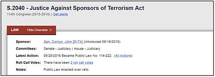 No matter, both Democrats and Republicans weighed in to support what John Cornyn, R-Texas declared: The bill “gives the victims of the terrorist attack on our own soil an opportunity to seek the justice they deserve.” Furthermore, Sen. Ben Cardin, D-Md, stated, “We cannot in good conscience close the courthouse door to those families who have suffered unimaginable losses.”