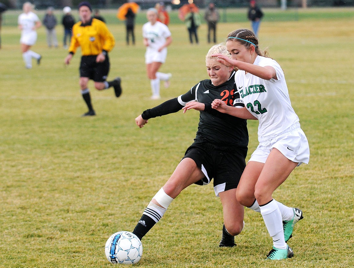 Flathead defender Clara Vandenbosch steals the ball from Glacier forward Gabbi Dickson during the second half at Glacier High School on Tuesday. (Aaric Bryan/Daily Inter Lake)