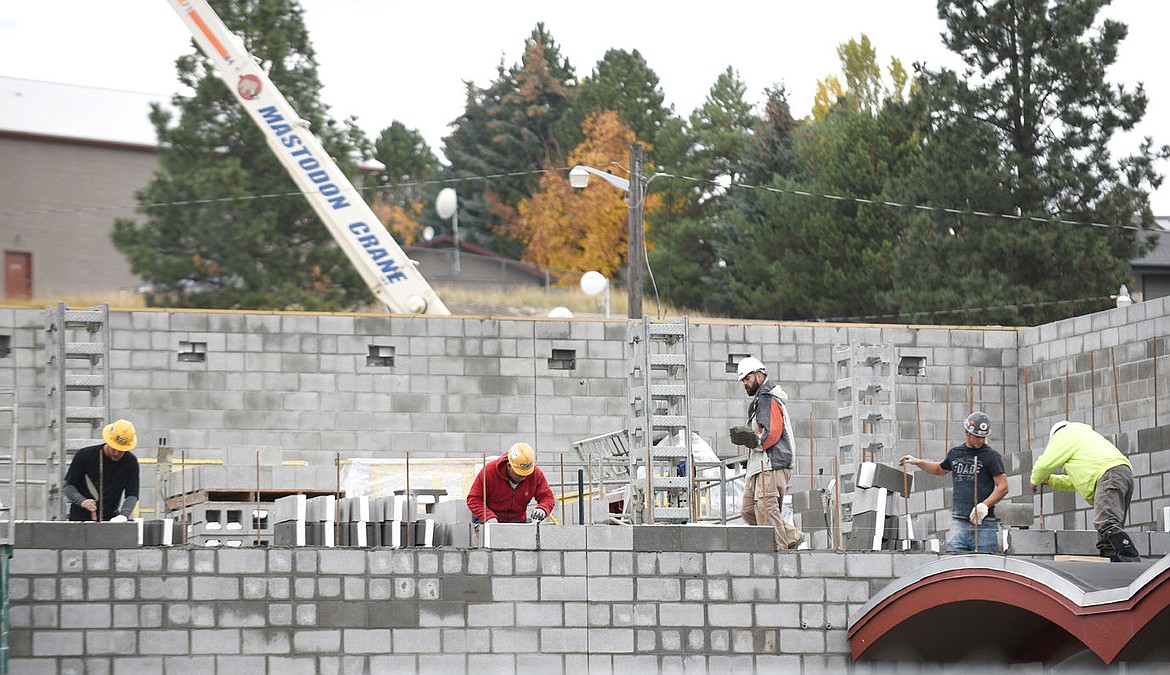 Workers install the wall to the community room at Bigfork High School on Tuesday.