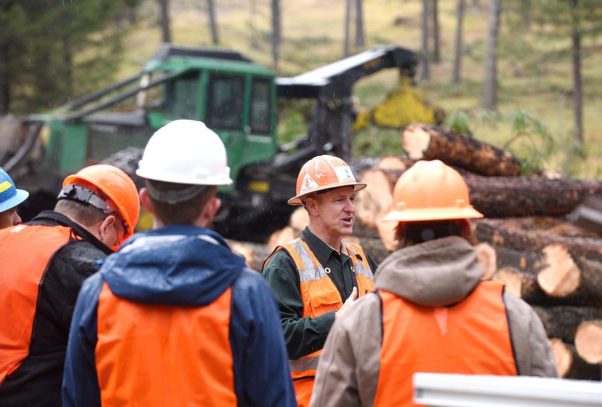Mark Boardman, a forrester for F.H. Stoltze Land and Lumber speaks to a group at the Spring Brook Ranch fuels reduction project during the 2016 Flathead Timber Tour on Thursday. (Aaric Bryan/Daily Inter Lake)