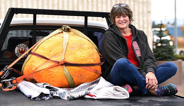 Jamie Wagner with a 175 pound Giant Atlantic pumpkin she grew this year. Wagner said she grew the pumpkin with information from the staff at Plant Land. She said the main reason she grew the pumpkin was to see if she'd be able to grow it in the Montana climate. (Brenda Ahearn/Daily Inter Lake)
