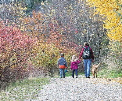 Mandy Rockwell took her children, Colter Anderson, 7, and Ellie Anderson, 4, for a walk on the Kootenai River Trail on Saturday afternoon with their dog, Tansy. (Caleb M. Soptelean/TWN)
