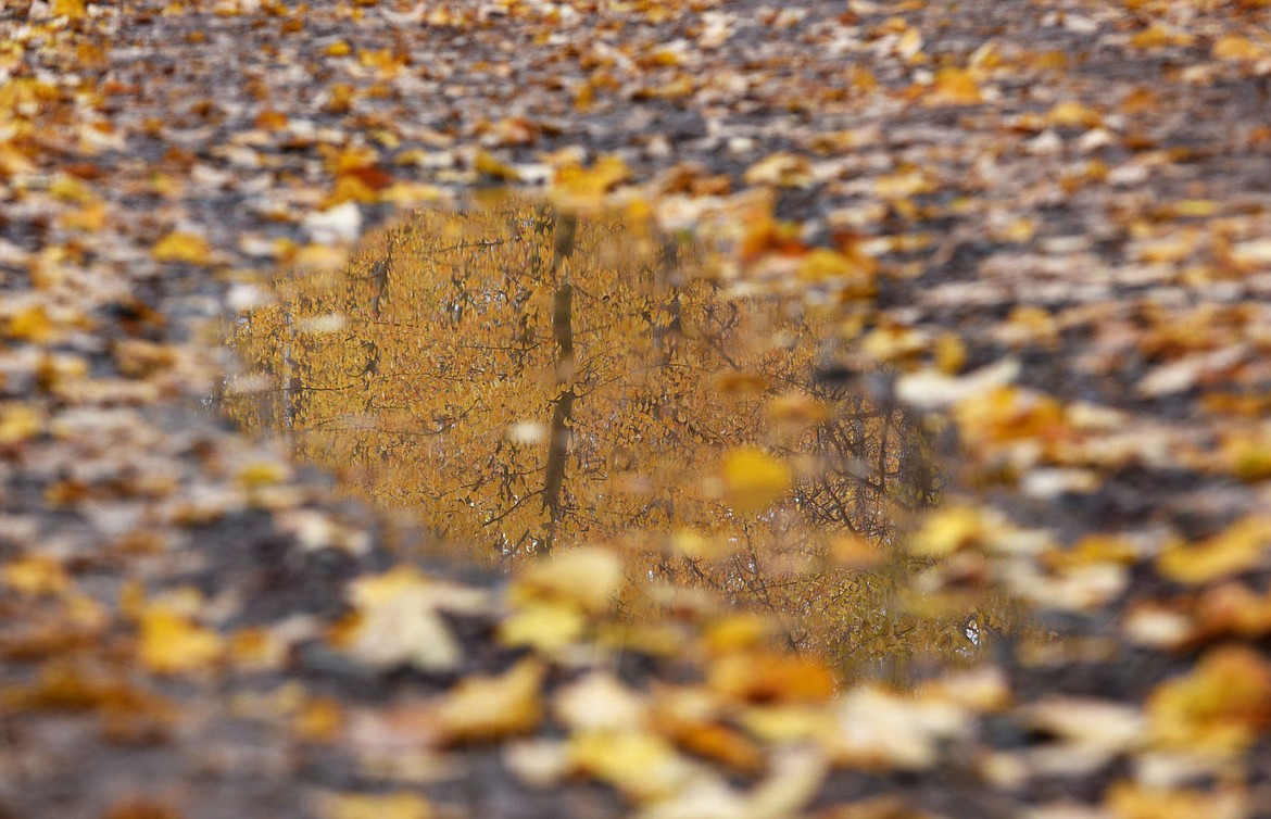A tree is reflected in a puddle at the Old Steel Bridge Fishing Access on Tuesday.
