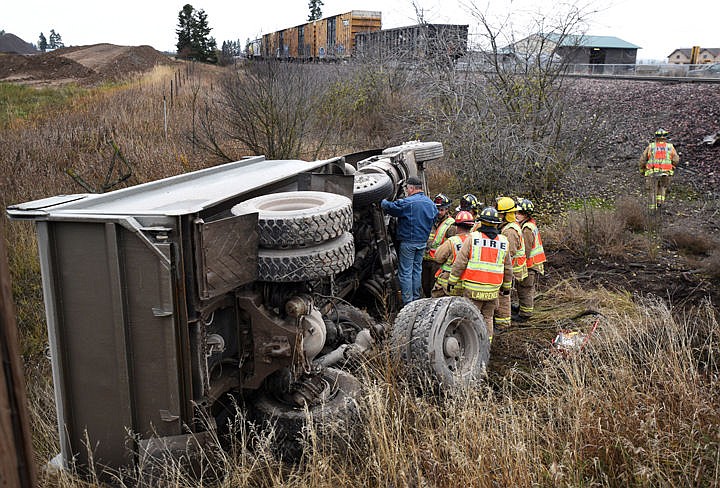 An east bound truck ended up on its side after it was struck by a south bound train at the intersection of the tracks and Jellison Road on Wednesday afternoon, October 26, near Columbia Falls. First responders included the Columbia Falls Fire Department, Flathead County Sheriff's Office and the Montana Highway Patrol. (Brenda Ahearn/Daily Inter Lake)